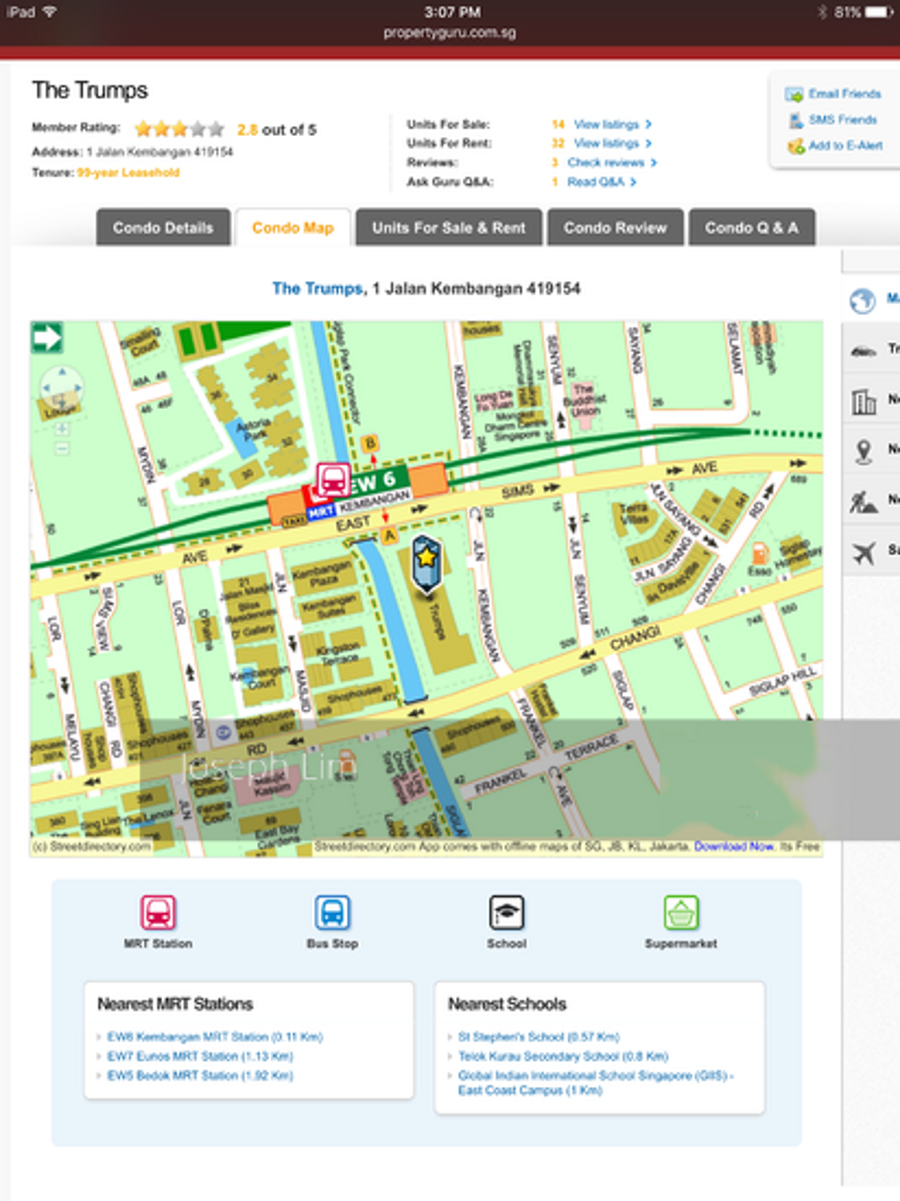 The Trumps is a short drive to Kembangan Plaza and Siglap Shopping Centre. It is also not far from several schools such as Haig Girls' School, Opera Estate Primary School and CHIJ Primary School (Katong).