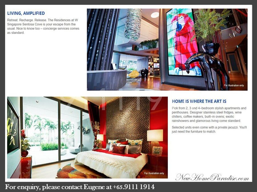 Residences @ W is the only branded residences and integrated development project in this exclusive enclave of Singapore on Sentosa Cove. With the Hotel, Retail, F&B and Specialty shops integrated under 1 roof; occupiers will enjoy the panoramic waterfront Living, yet are just minutes away from amenities, available right at its doorsteps.