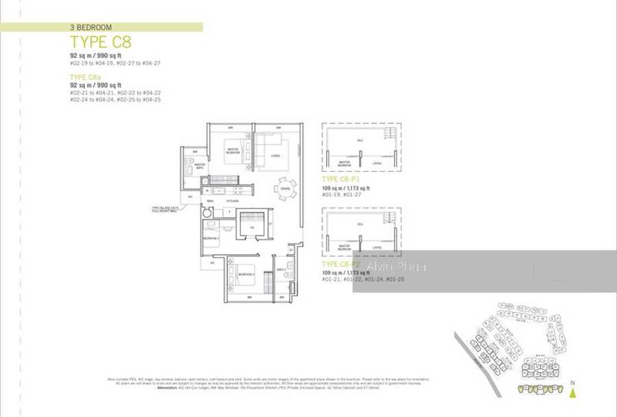 3 bedroom, 990 sq ft, corner unit.