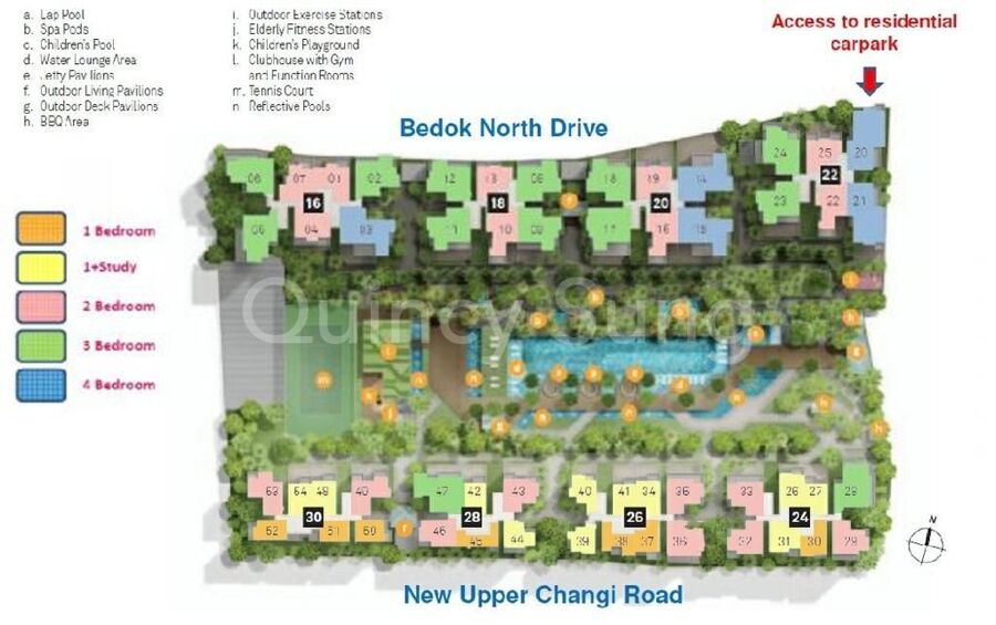 Condo Facilities in Bedok Residences - BBQ pits In Maze, Covered car park, Function room, Gymnasium room, Jacuzzi, Playground, Sauna. Steam bath, Swimming pool, Tennis courts, Wading pool