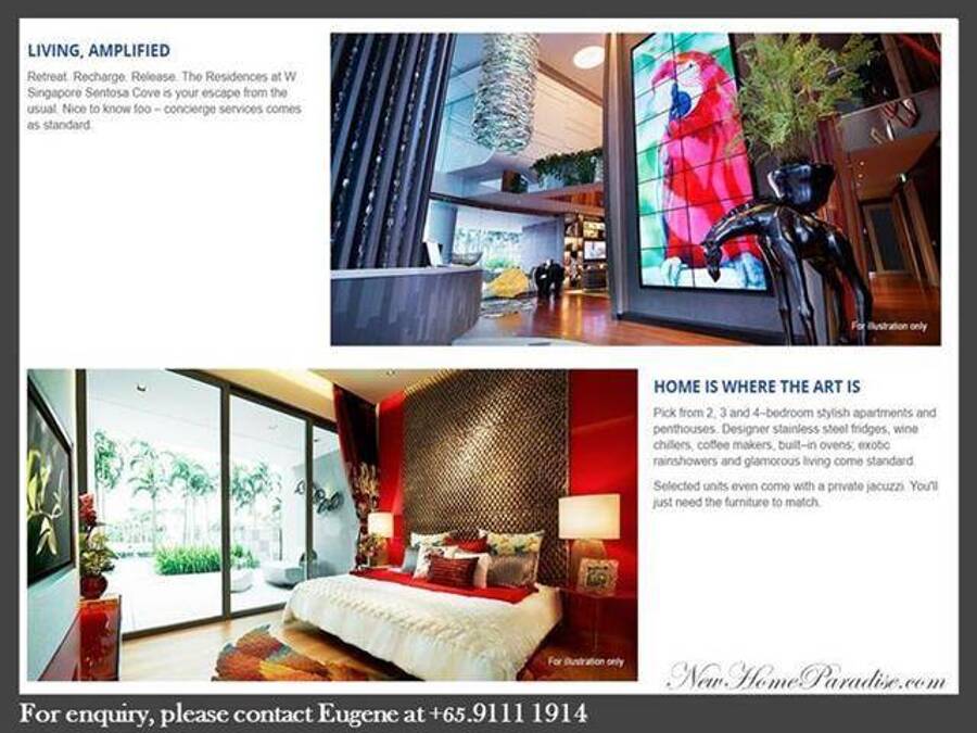 Residences @ W is the only branded residences and integrated development project in this exclusive enclave of Singapore on Sentosa Cove. With the Hotel, Retail, F&B and Specialty shops integrated under 1 roof; occupiers will enjoy the panoramic waterfront Living, yet are just minutes away from amenities, available right at its doorsteps.