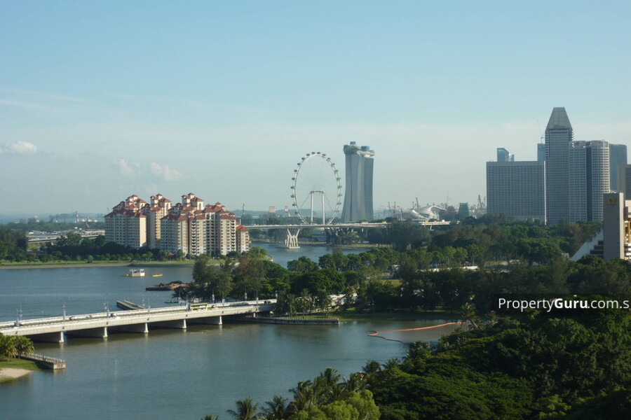 Panorama view of Kallang River, Sports Hub, Sheares Bridge, Marina Bay, Garden by the Bay, MBS, CBD.