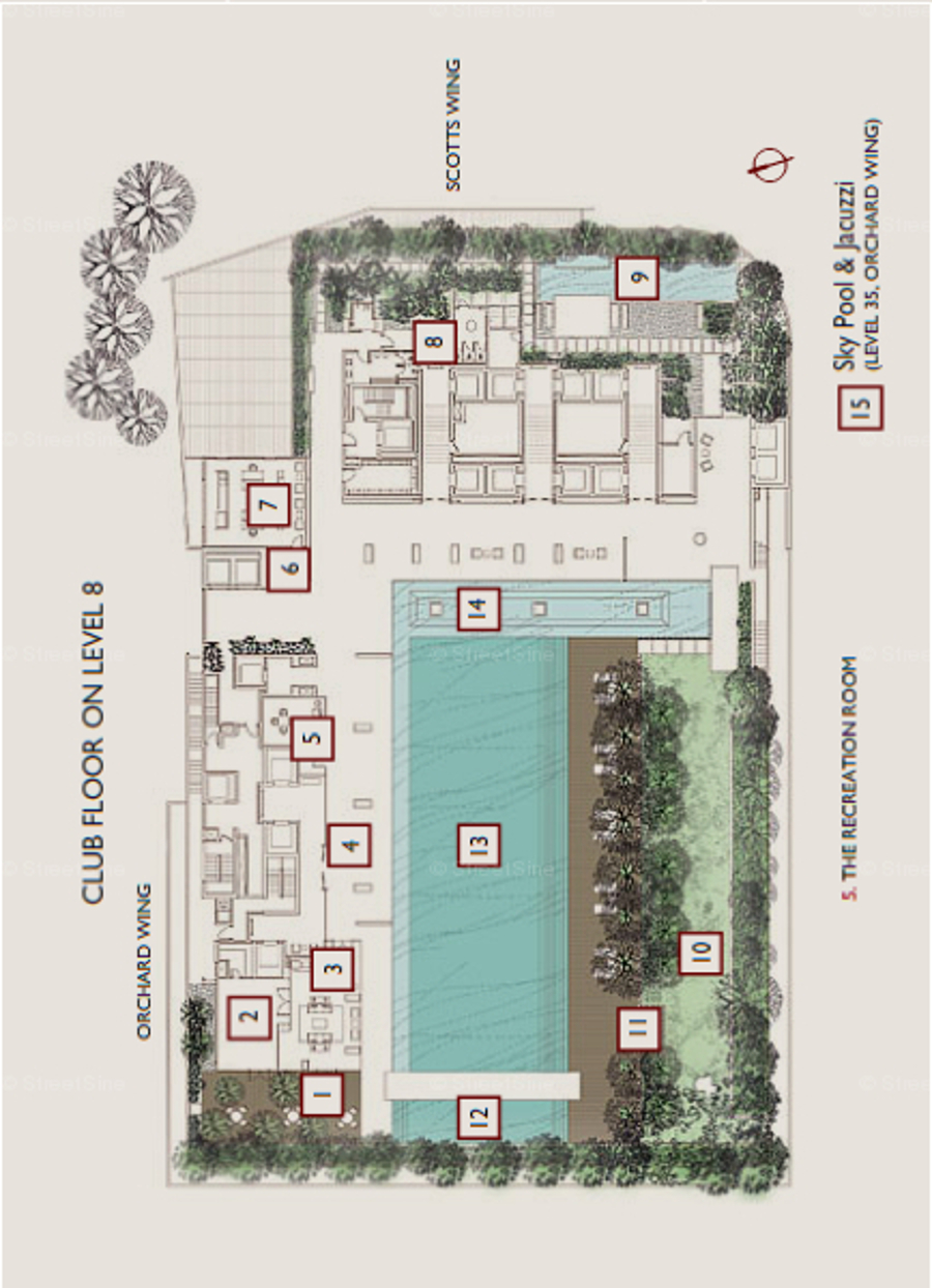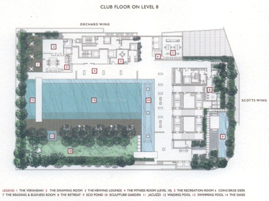 Facilities at Scotts Square include swimming pool, sky pool, fitness room, recreation room, reading room, meeting room, and drawing room.