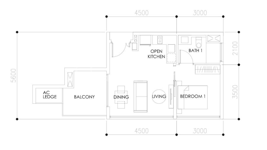 -- Living Room + 1 Bed Room + 1 Bathroom + 1 Balcony + 1 Kitchen (Open Concept)